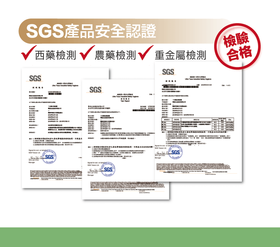 本食品經SGS檢驗測試360項常見西藥認定分析(含括抗生素類、降血壓類、神經興奮劑類、荷爾蒙類、腸胃類、解熱止痛劑、精神用藥、糖尿病用藥、鎮咳祛痰劑、類固醇類與其他),認定不含360項常見西藥成分。